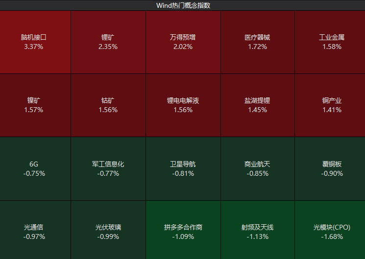 盘面上,脑机接口概念延续强势,锂矿股大涨,CPO概念股跌幅居前。